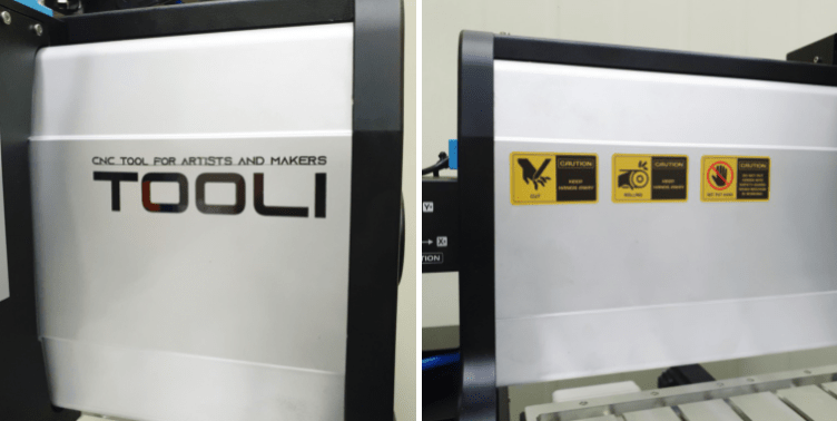 Here we see our Tooli logo. It is minimalistic, as well as quite modern. Our team put a lot of time and effort designing this, and our warning stickers can be seen quite clearly on the front face of the machine to help warn the workers of the potential safety hazards while working with our machine.